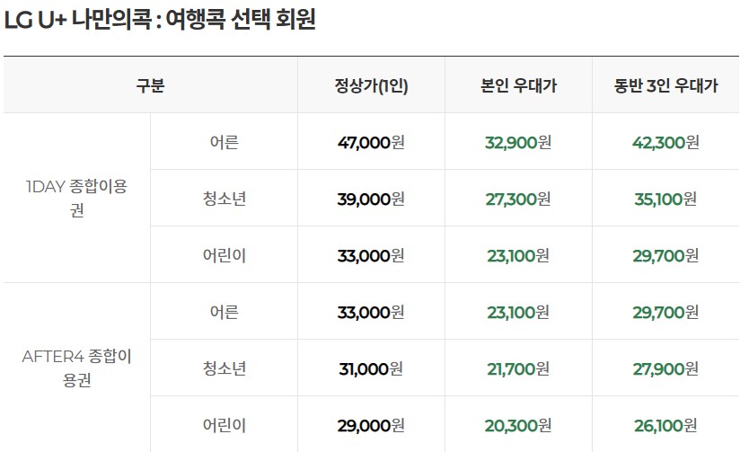 1일 종합이용권만 할인을 받을 수 있으며 어른, 청소년 권만 제공됩니다.